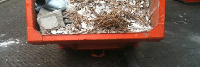 Alweer een container vol! Radiatoren boven zijn eruit, weer twee rieten plafonds verwijderd, ons bad is voorgoed onbruikbaar 🙂