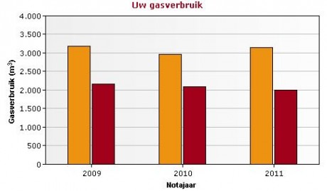 Op de website van Eneco (waar wij onze energie afnemen) kun je een grafiekje opvragen van je energiegebruik. Ons gasgebruik is ondanks de strenge winter van 2010-2011 redelijk constant, maar wel een stuk hoger dan dat van onze buren. Dat heeft natuurlijk alles te maken met de ongeïsoleerde kopgevel. Daar gaan we wat aan doen!