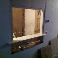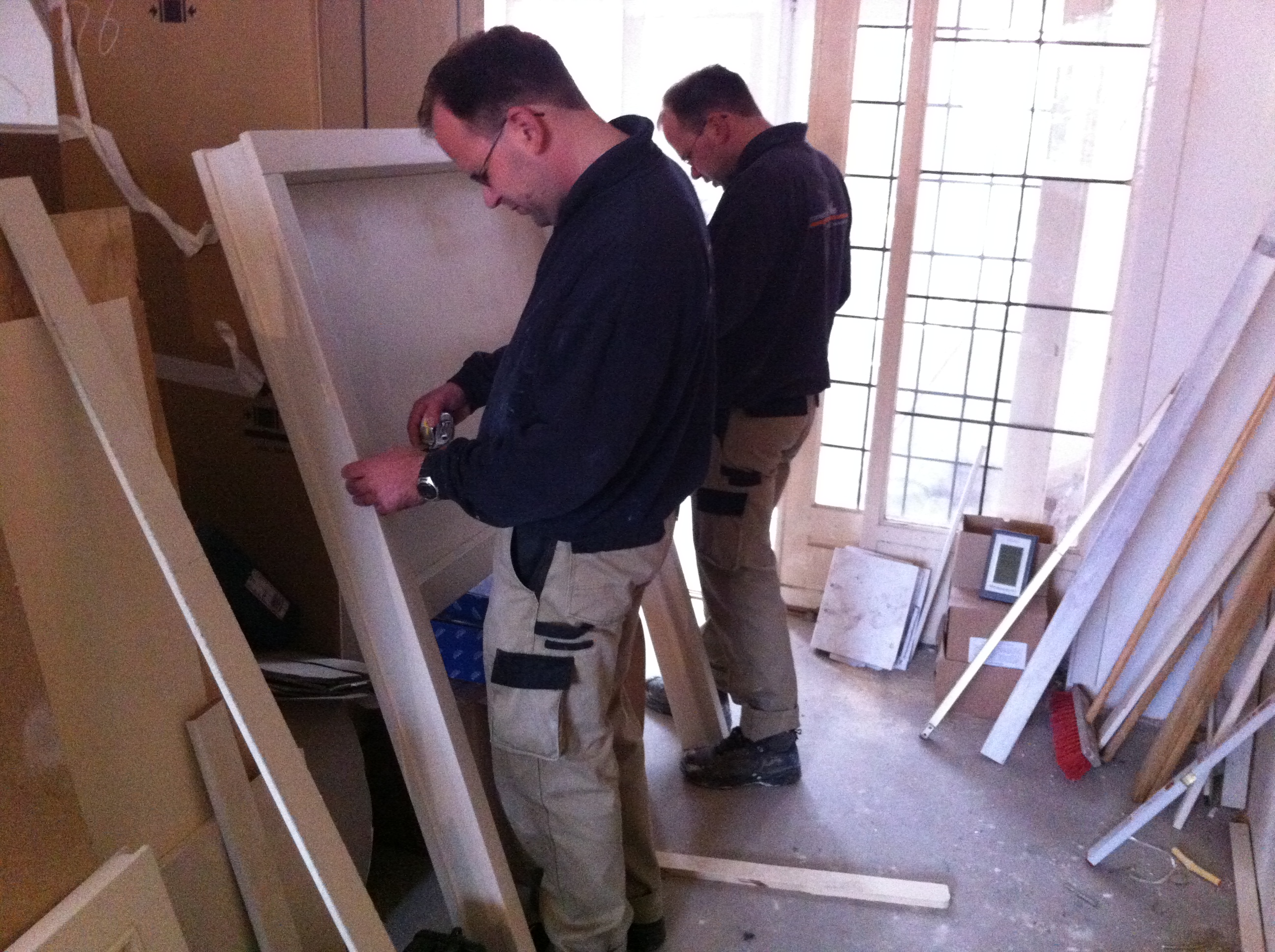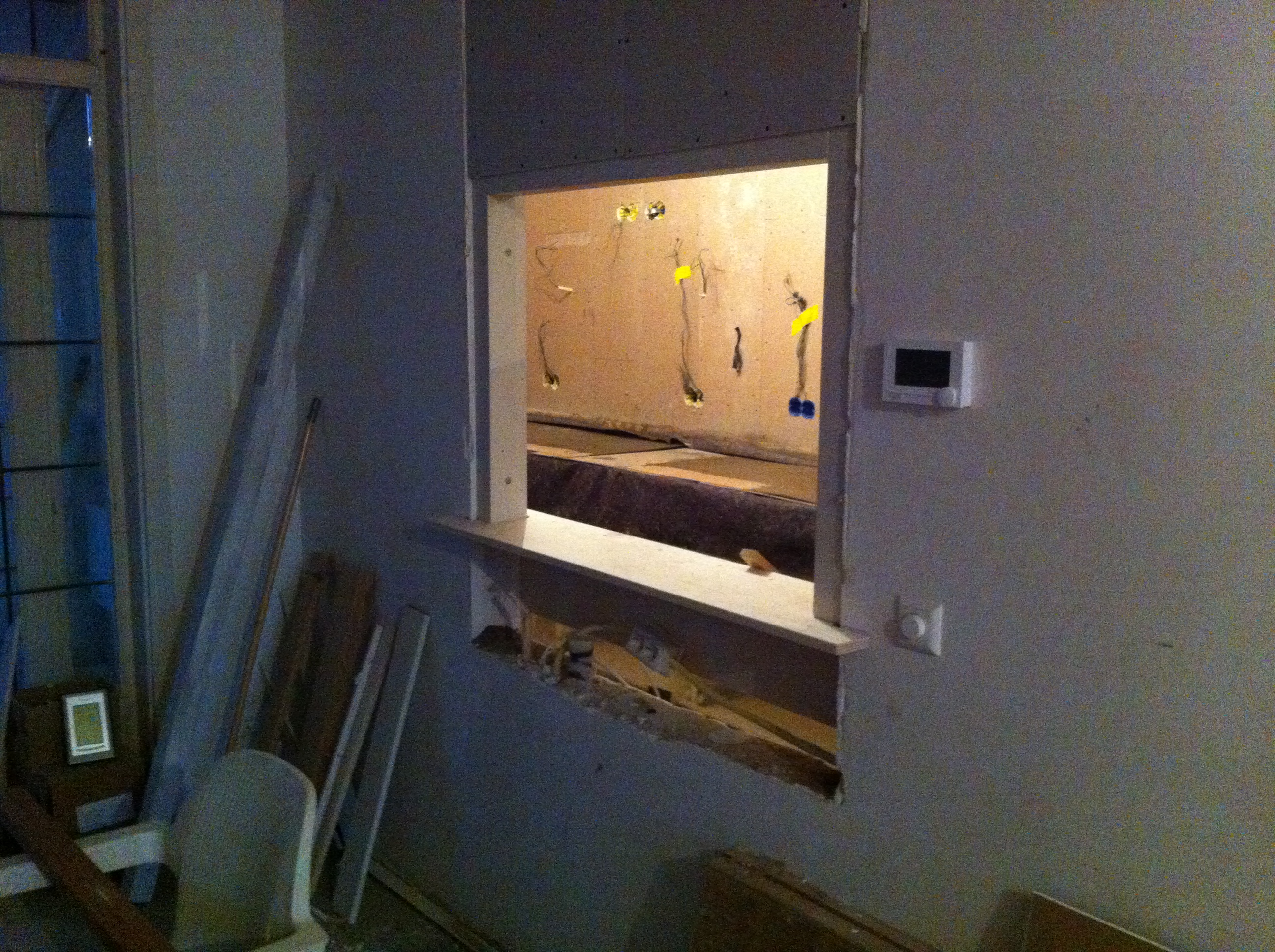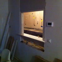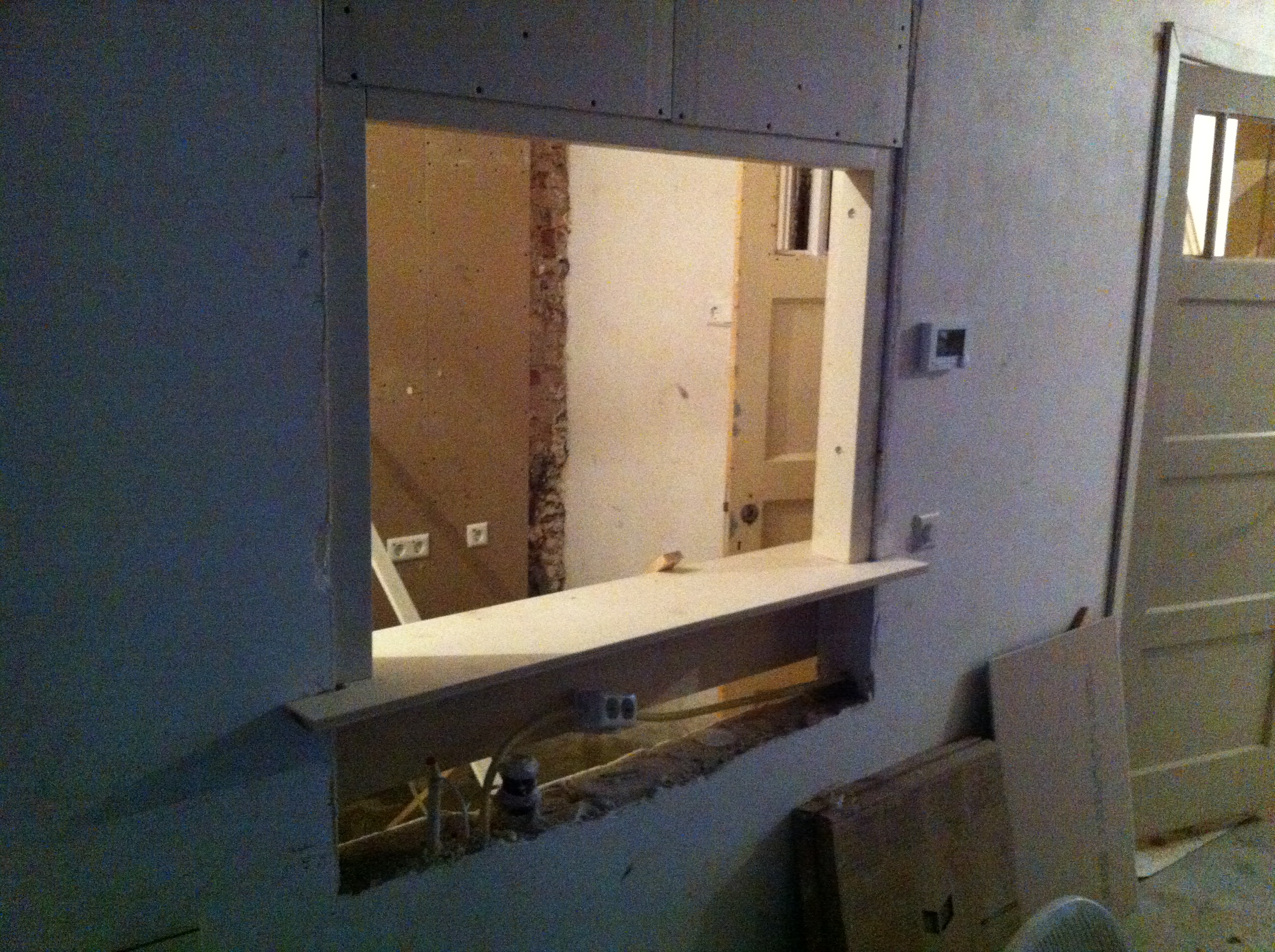 Om tijdens het kokkerellen contact met onze gasten aan de eettafel te hebben moesten we iets verzinnen tussen keuken en woonkamer. Het is een keukenluik geworden en is vandaag geleverd. We zijn meteen begonnen met plaatsen. Het is groter geworden dan ik had verwacht, maar dat is alleen maar goed als we het oorspronkelijke doel van het luik herinneren.
