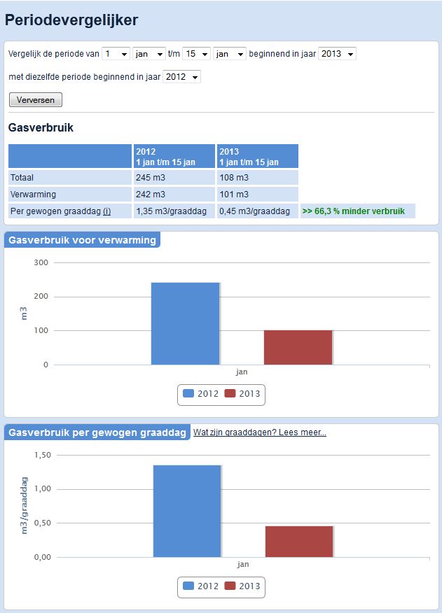 Grafiekjes van www.mindergas.nl, gecorrigeerd voor de buitentemperatuur aan de hand van gewogen graaddagen en dus wetenschappelijk onderbouwd.
